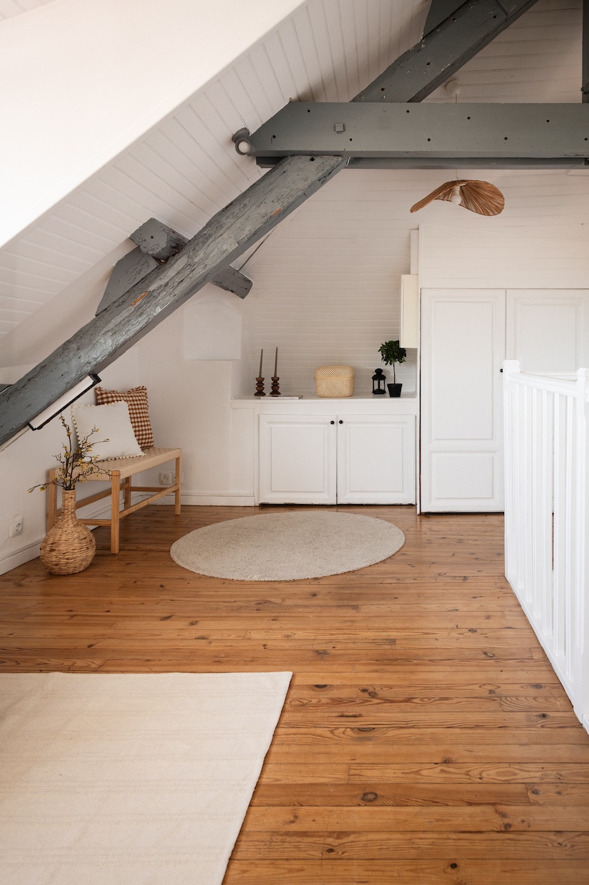 À l'étage, la maison offre un espace de vie spacieux et lumineux avec un séjour ouvert, une cuisine intégrée et une salle de bain complète avec baignoire.