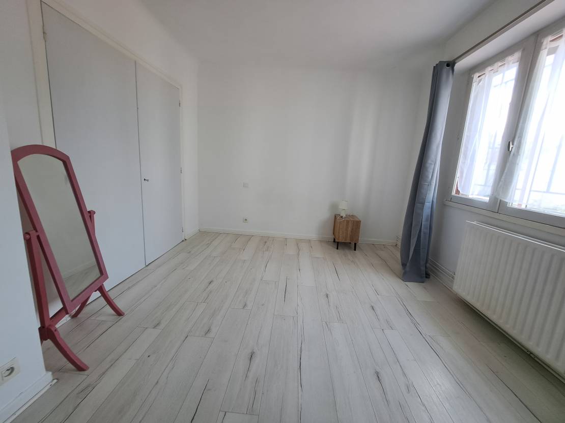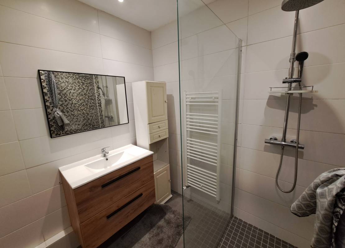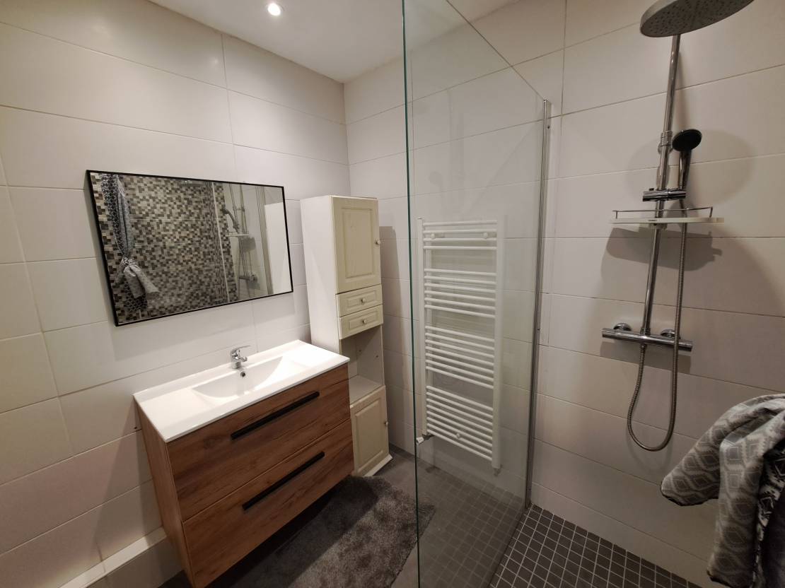 La salle d’eau rénovée avec goût apporte une touche moderne et soignée au logement.
