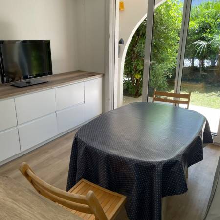 Dans une copropriété avec piscine et espace vert, vous trouverez ce studio refait pouvant accueillir 4 couchages grâce à sa vaste pièce de vie.